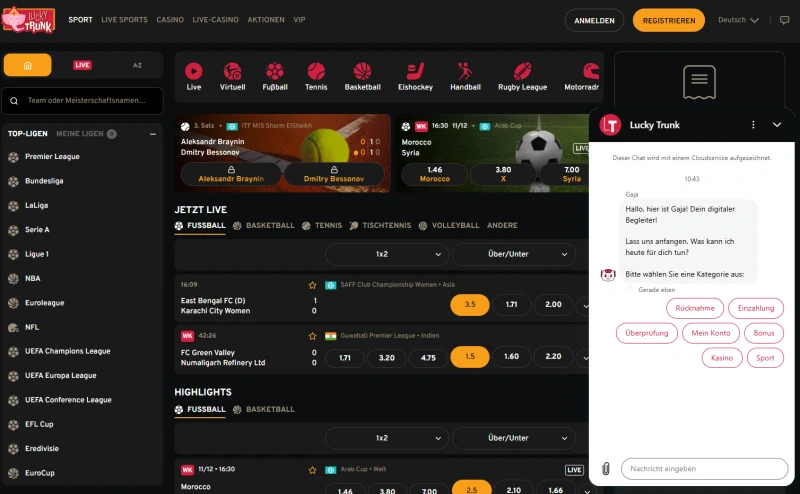 Das LuckyTrunk Sportwettenangebot zeichnet sich durch klare Navigation und schnellen Zugriff auf Live-Events, Top-Ligen und gefragte Märkte aus. Fußball steht im Vordergrund mit intensiver Berichterstattung über die Premier League, Bundesliga, LaLiga, Serie A, Ligue 1 und die großen UEFA-Wettbewerbe. Tennis, Basketball, Eishockey und Handball sind ebenfalls stark vertreten, und je nach Sportkalender finden Sie auch Nischenoptionen.