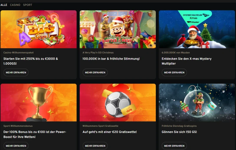 Beim Casino-Willkommenspaket hat der erste Bonus x40 Umsatz, der zweite x35, und die Freispiele aus dem dritten Schritt haben x30 Umsatz auf Gewinne; einige wöchentliche und Sportangebote können andere Raten haben, daher solltest du immer die Bonusbedingungen prüfen.