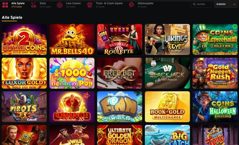 Die LuckyTrunk Spielelobby fühlt sich groß an, ist jedoch nie überfordernd. In einer Gesamtbibliothek von 2.713 Spielen finden Sie 2.354 Slot-Titel und eigene Bereiche für Live-Tische, Tisch- & Crash-Formate sowie leichtere Glücksspiele:
